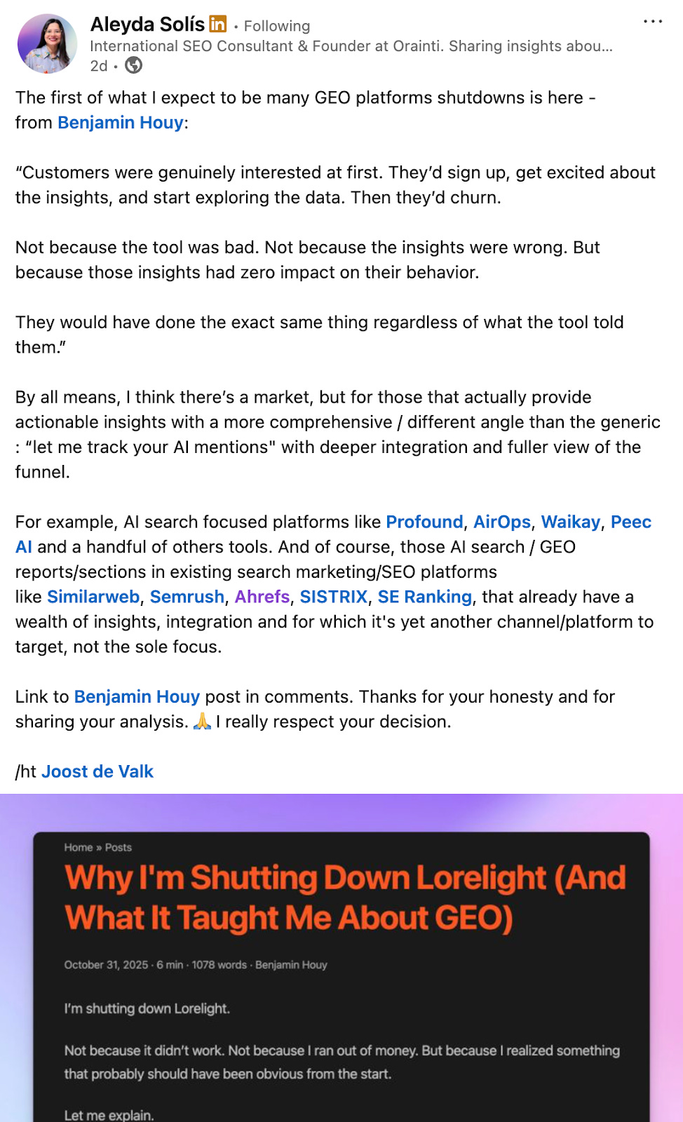 To put it another way, many of the tools that raise money and enter the AI visibility tracking (or however you want to call it) race aren’t going to make it.