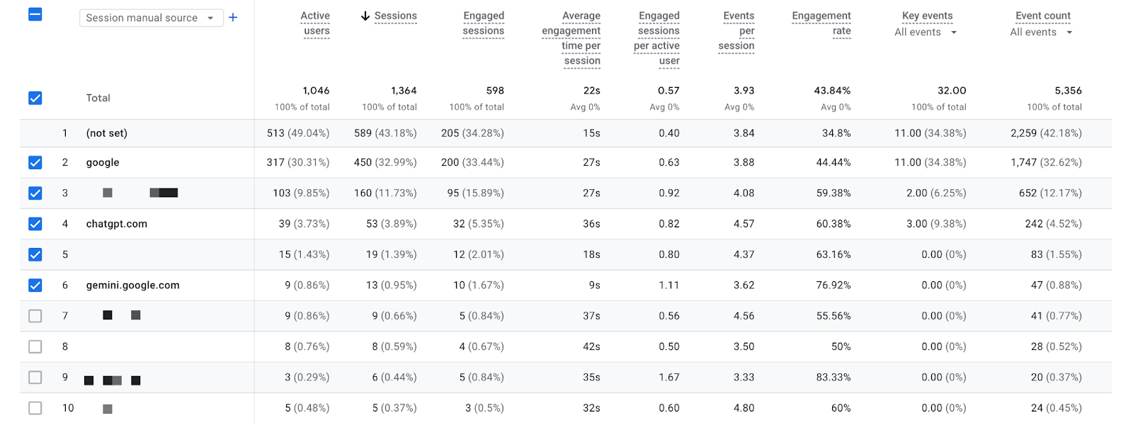As you can see, ChatGPT and Gemini are both drivers of referral traffic for our website, even though they don’t perform as well in terms of events.