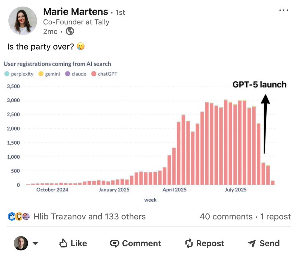 First of all, there are already many voices raising the fact that AI search referral traffic may have reached its peak.