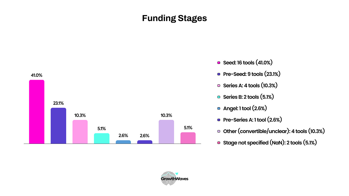 Early (Pre-Seed / Seed / Angel / Pre-Series A): 27 tools (69.2%)
