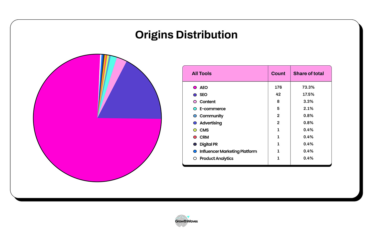 As we shared above, the AI search tracking market is overwhelmingly AEO-first: In our dataset of 240 tools, 176 tools (73.3%) are native AEO products, built around AI search from day one, while 42 tools (17.5%) are SEO-origin platforms extending into AI search.