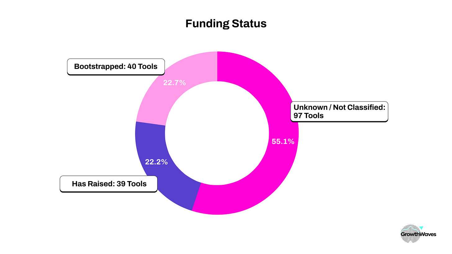 Roughly one in five AEO tools is known to have raised funding. About one in five is (still) bootstrapped. Just over half have no reliable human funding status (these are often very small/opaque tools).