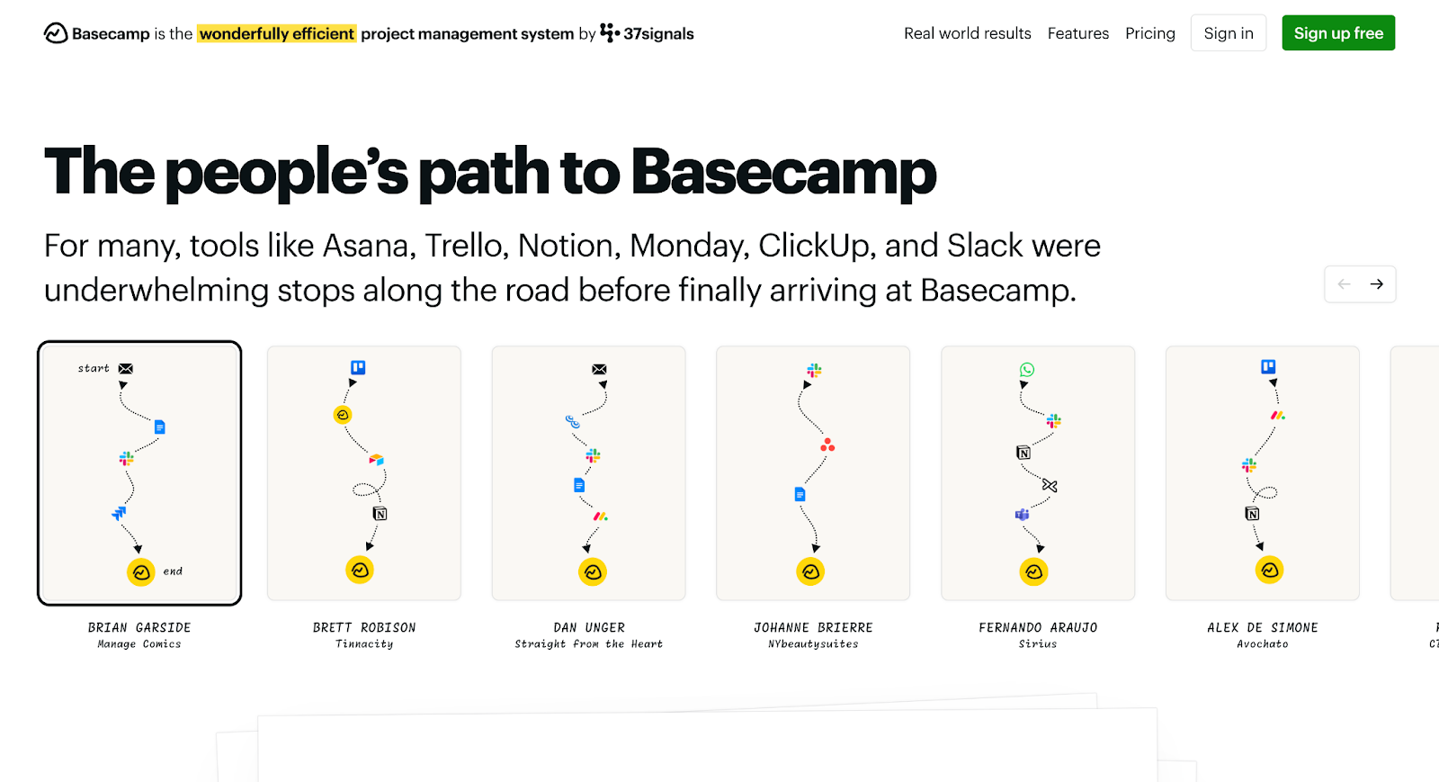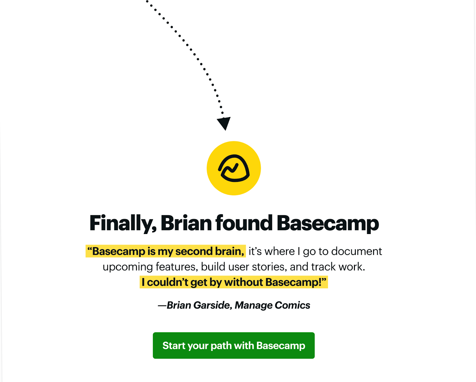 At the end of every path, there’s a testimonial from the user (who took that path) and a CTA for people to ‘Start their path with Basecamp.’