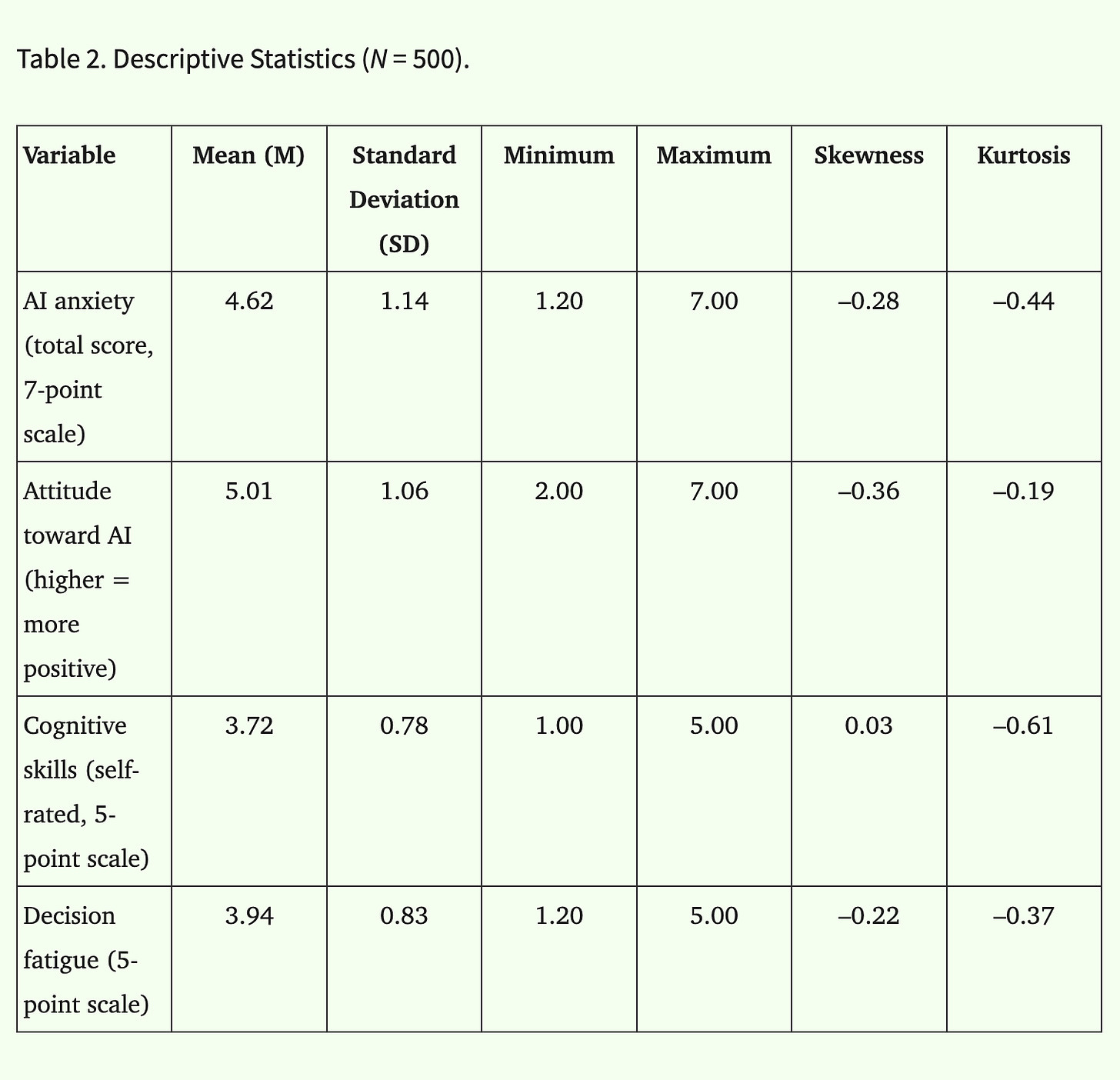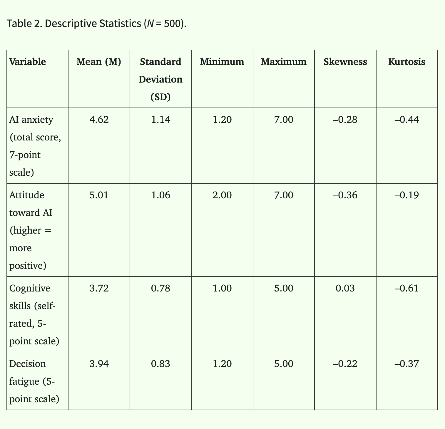 The same study found an inverse relationship (r = â0.360) between AI use and decision-making self-confidence. In plain English: the more people use AI tools, the less confident they become in their own judgment.