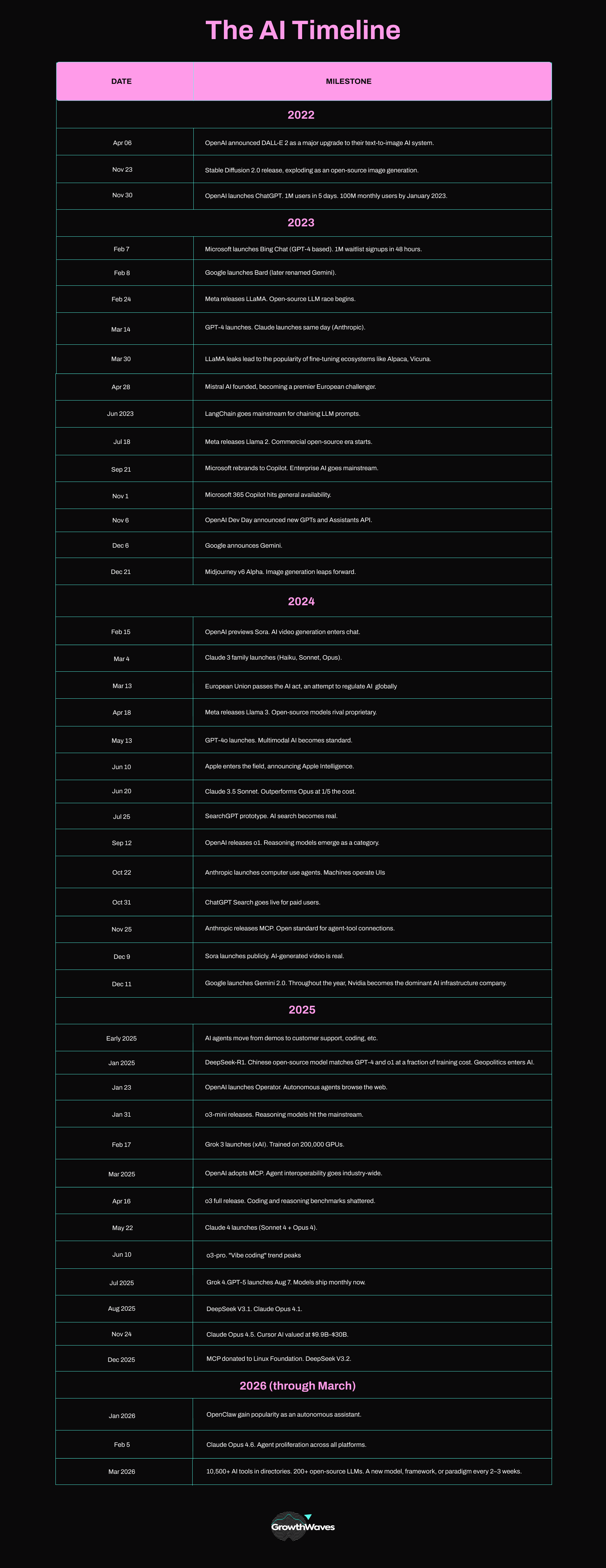 Because when you compress the timeline of AI development from April 2022 to March 2026 into a single view, the sheer density of what happened becomes visceral.