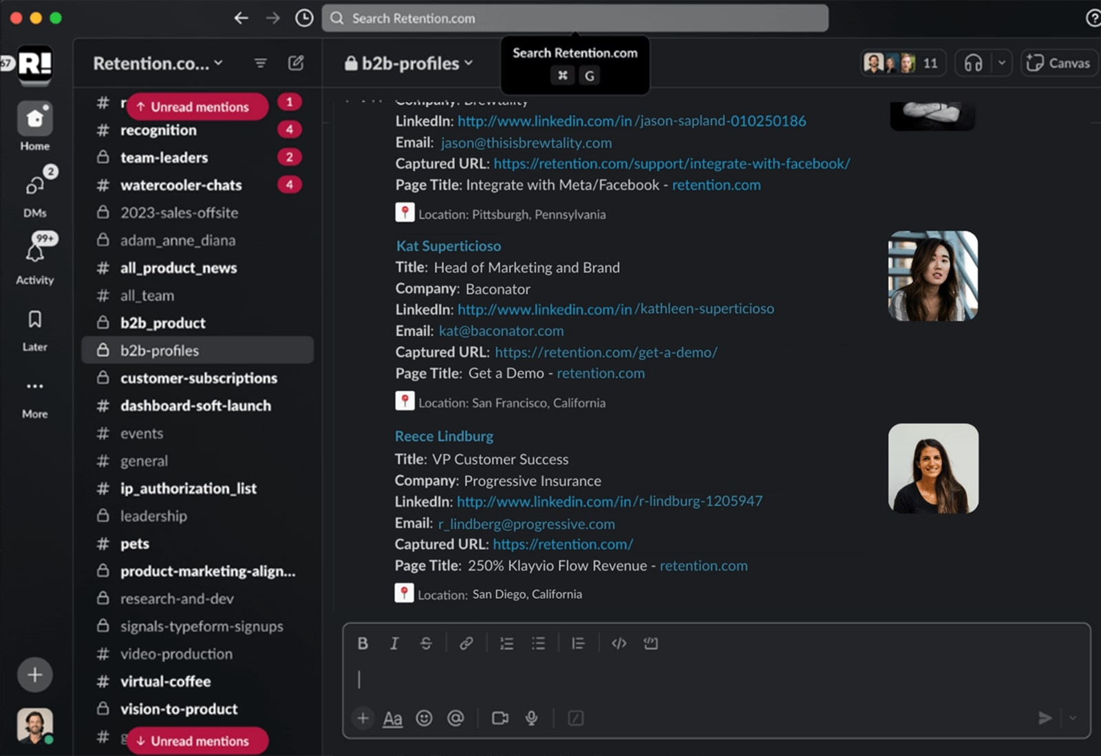 RB2B is a tool that identifies the exact person (from the US) who visits your company website and then feeds you that information through Slack.