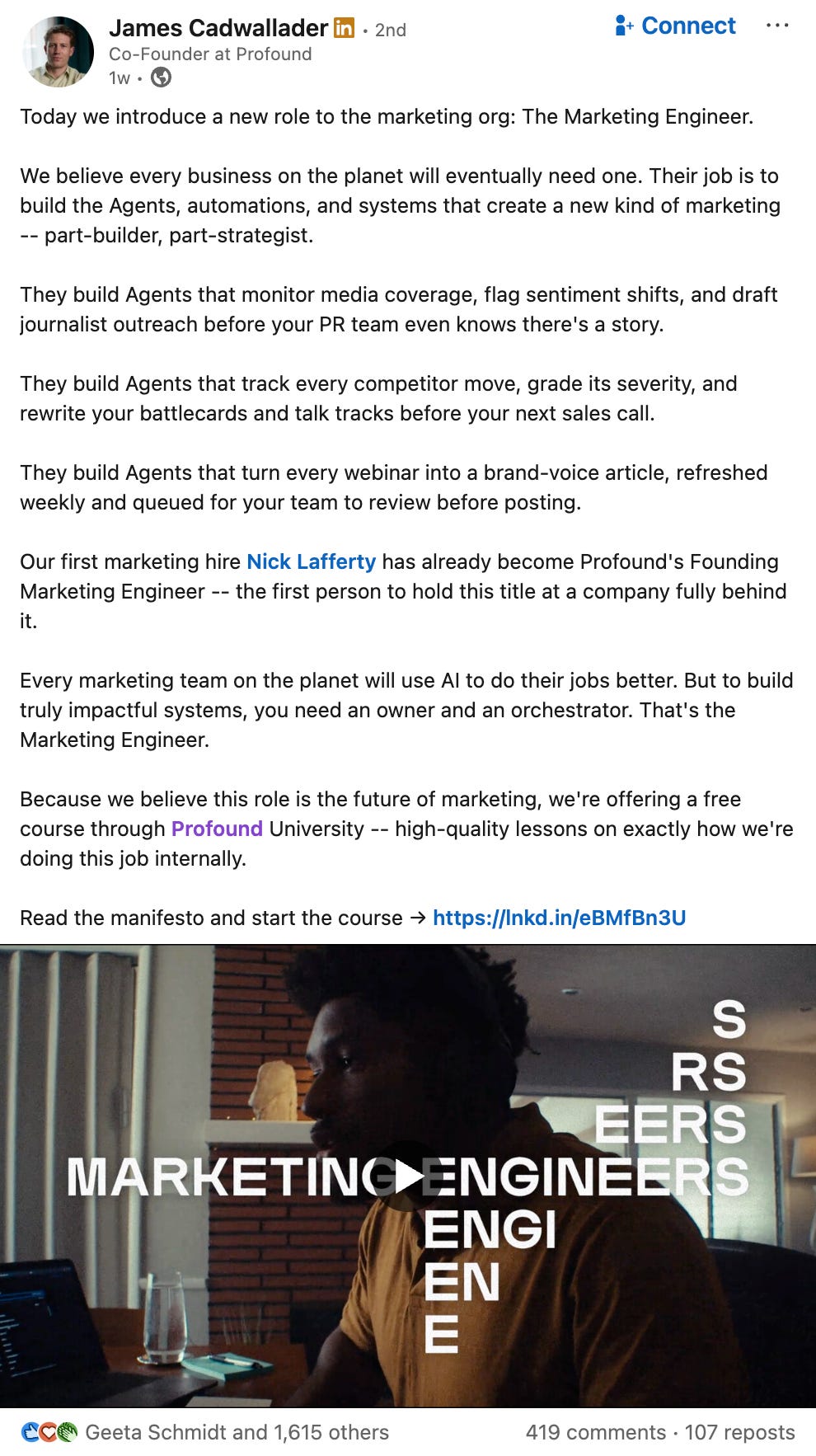 James Cadwallader, co-founder and CEO of Profound, published a post announcing that the company was formalizing the Marketing Engineer as a new role.