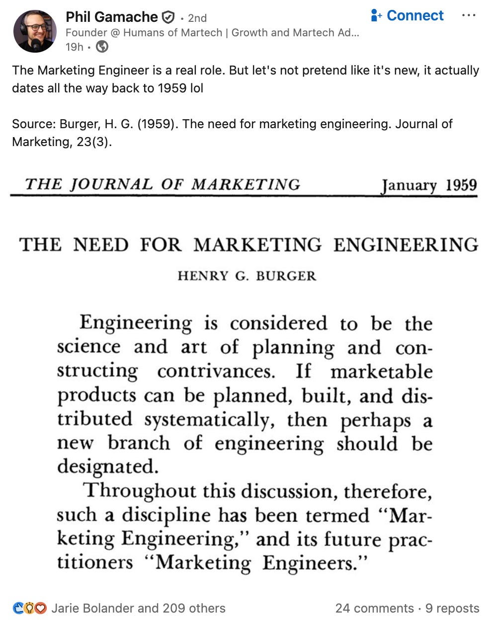 Phil Gamache, founder of Humans of Martech, shared an interesting post on LinkedIn, where he cited an academic paper from 1959 by H.G. Burger titled “The Need for Marketing Engineering,” published in the Journal of Marketing.