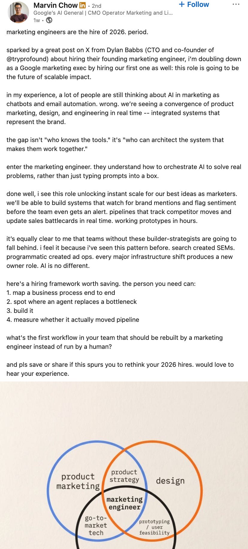 And within days, Marvin Chow, a marketing executive at Google, posted that he was hiring their first Marketing Engineer too. He called it “the hire of 2026.”