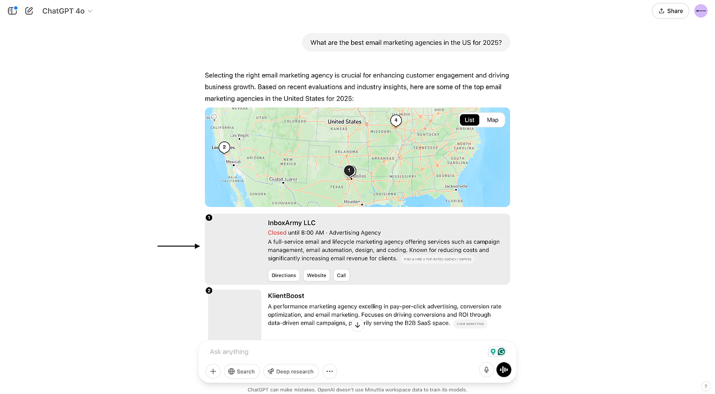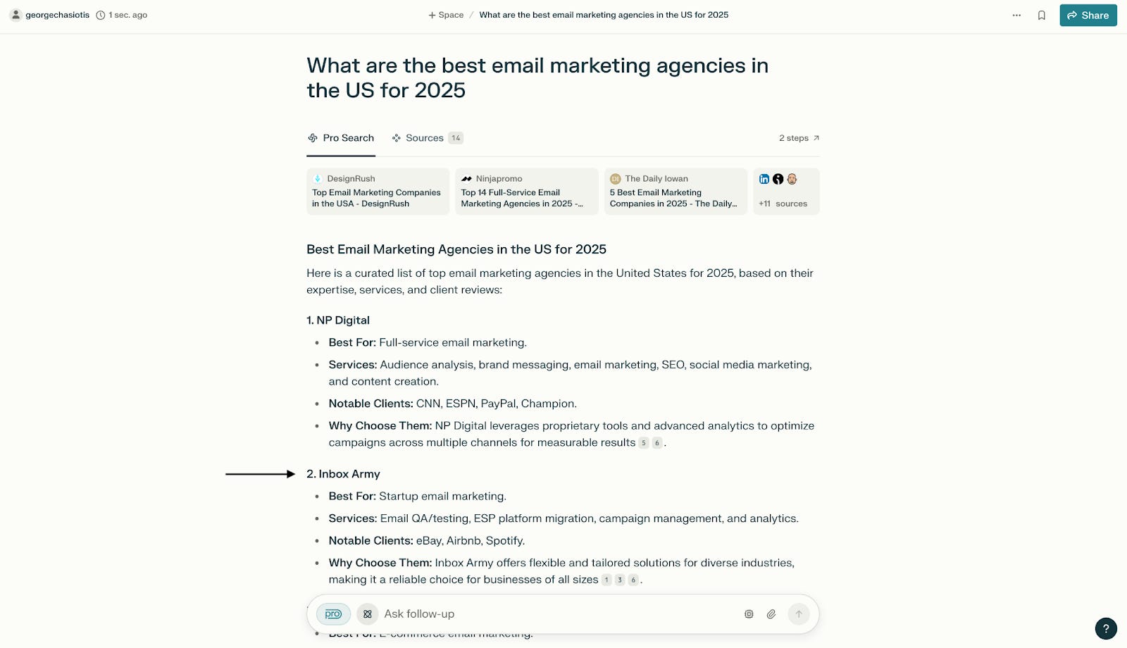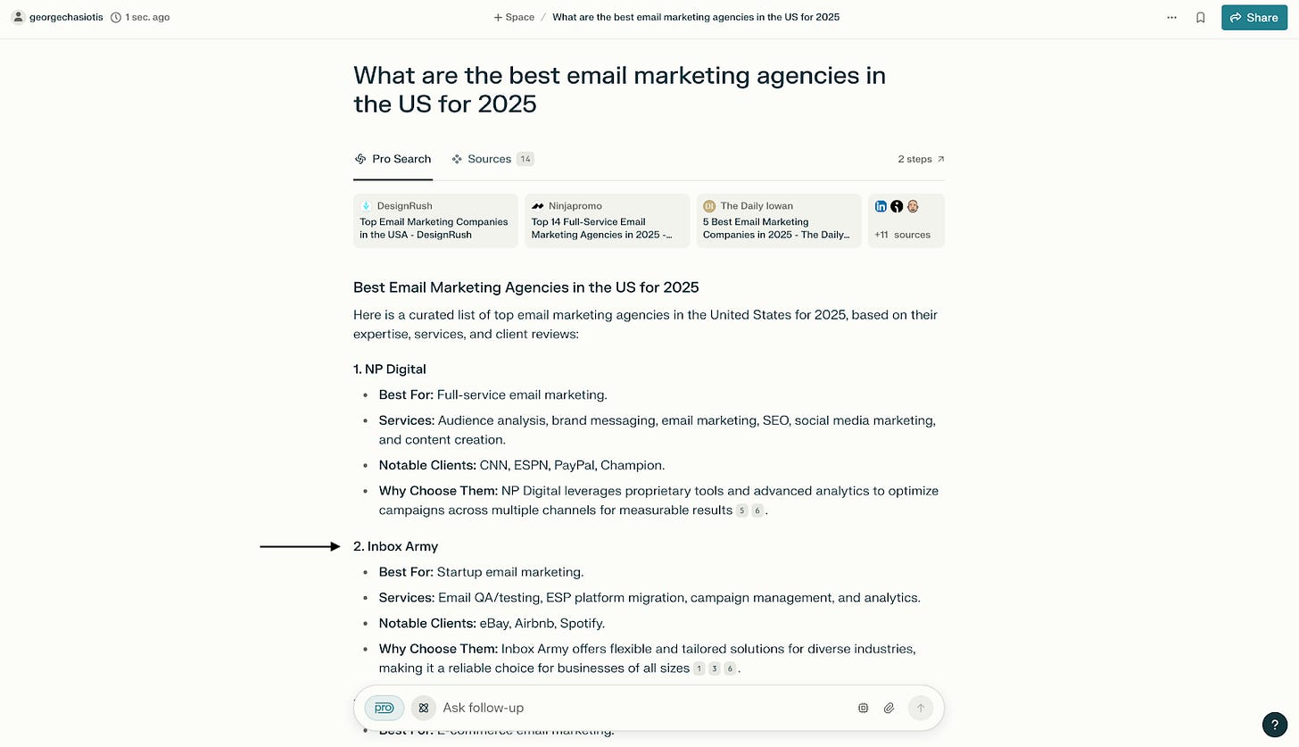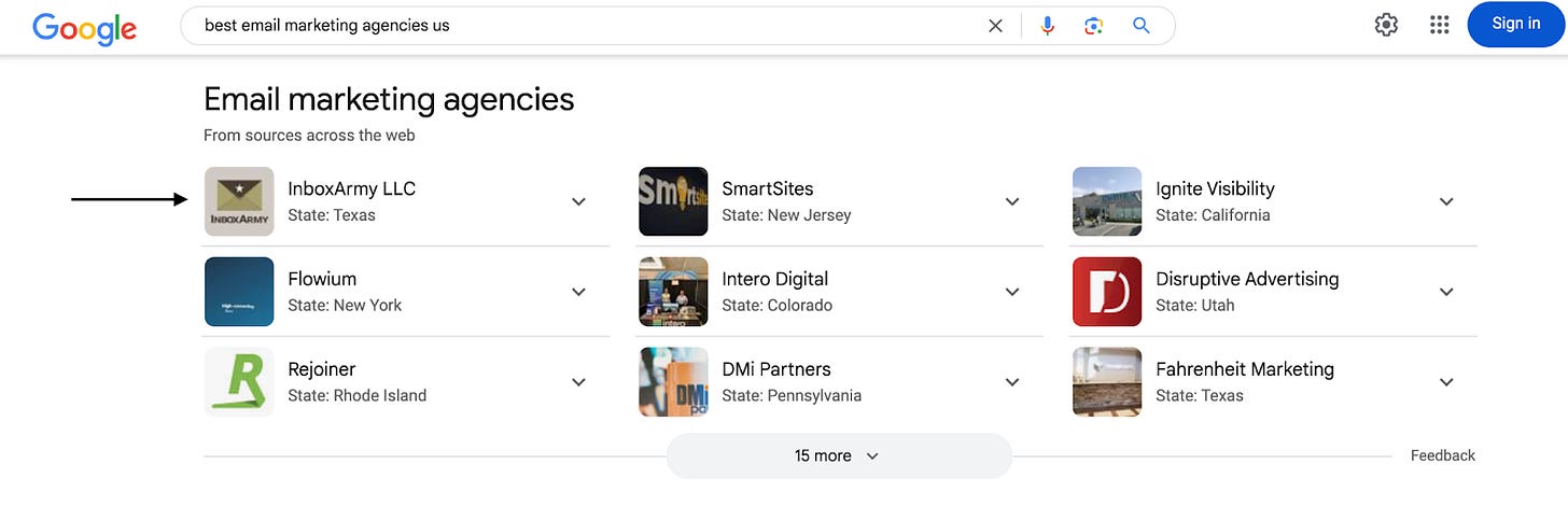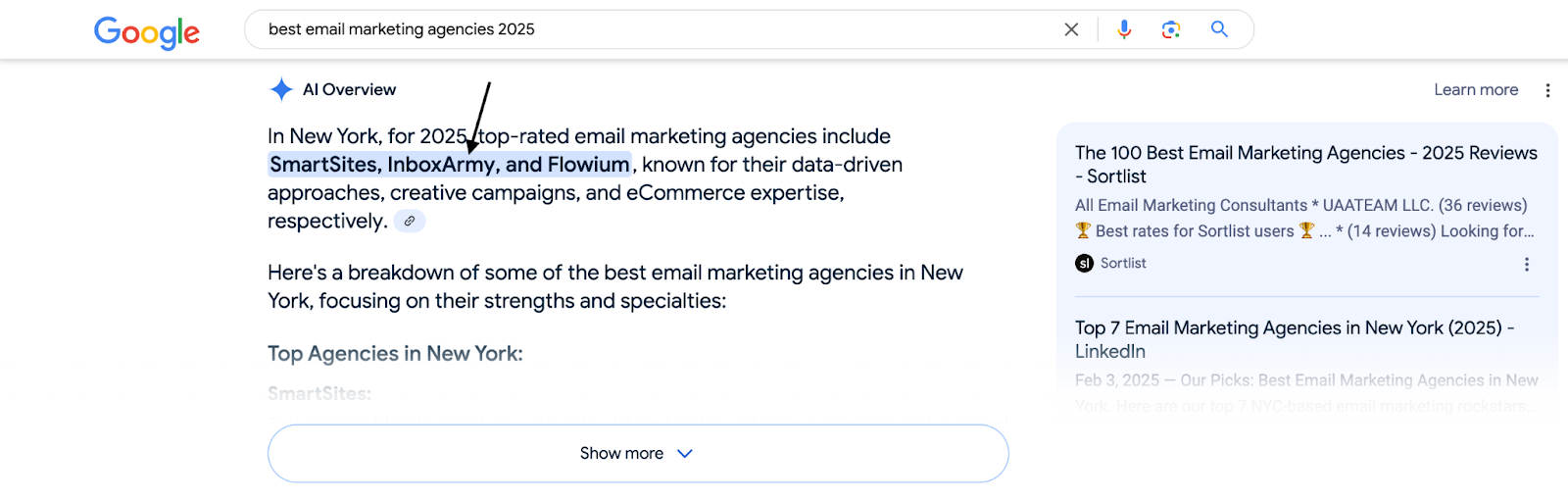 The brand that John and the team at Chilli Fruit helped is InboxArmy, an email marketing agency. Let’s take a look at the results. Here’s what you get when you search for something like ‘best email marketing agencies 2025’ in Google Search: