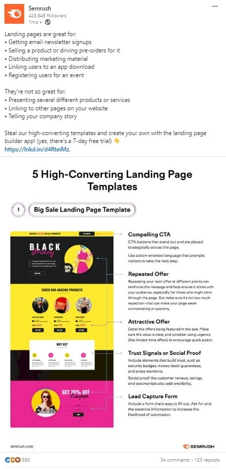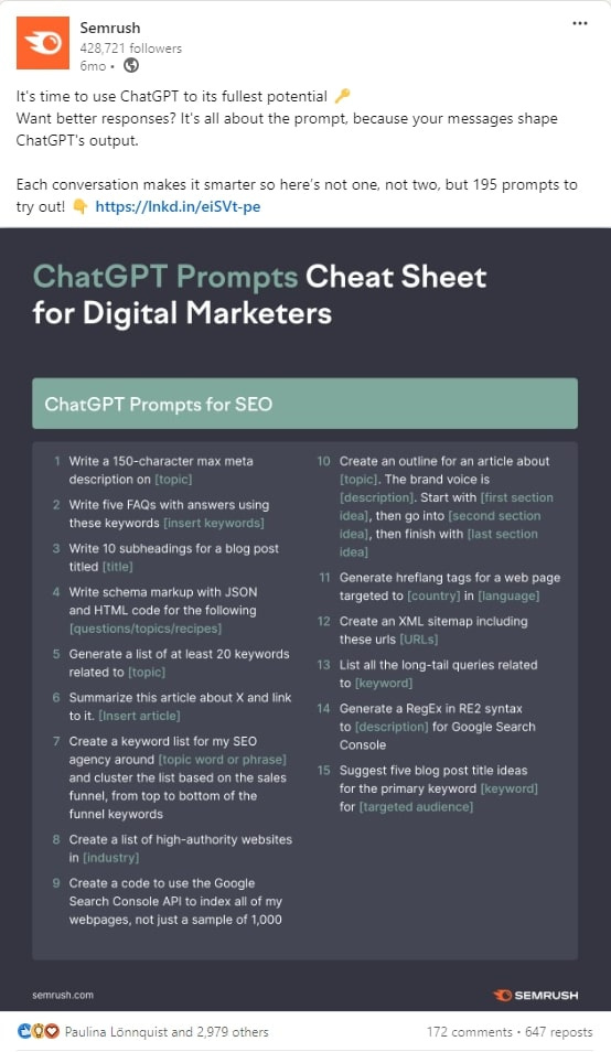 I already mentioned that some of Semrush’s top-performing posts on LinkedIn provide actionable industry-related resources.