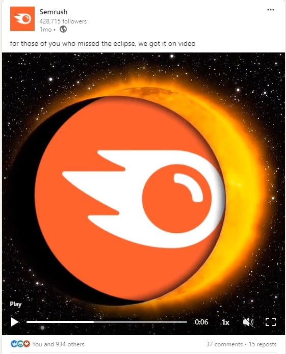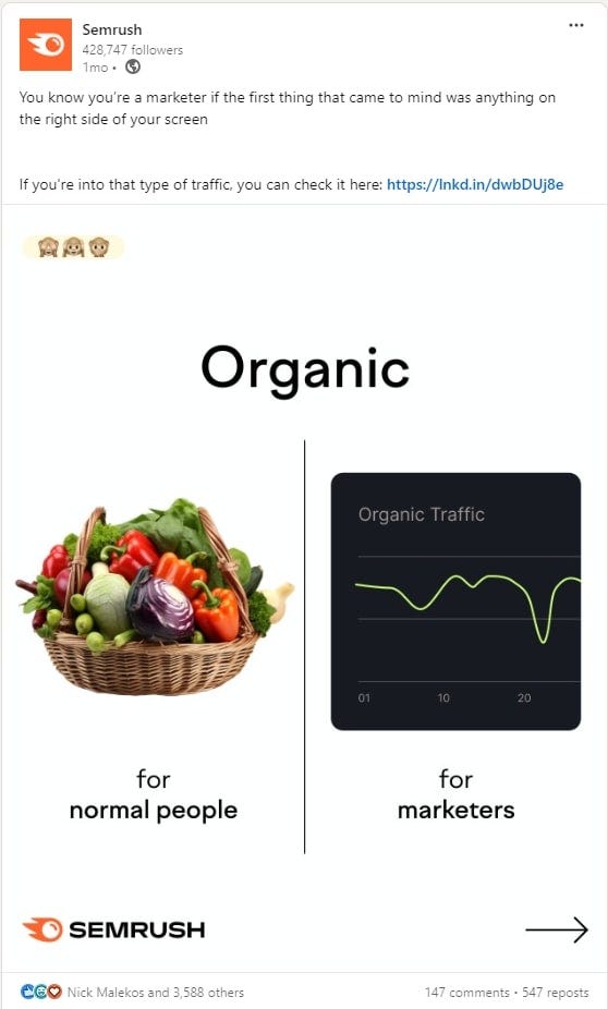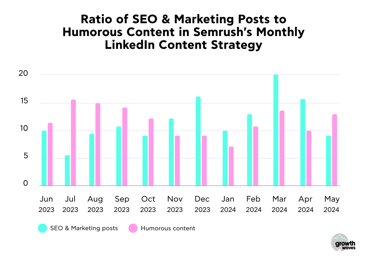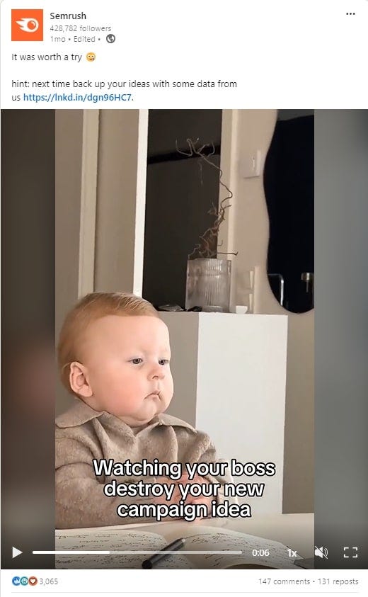 So, posts on SEO & marketing (delivering practical value) and humorous content are consistently present in Semrush’s monthly LinkedIn content strategy.