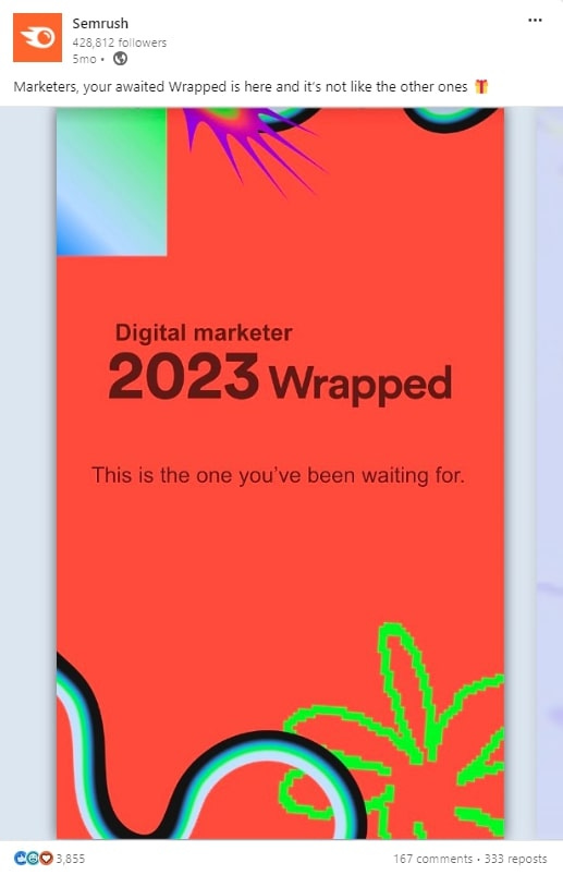 Knowing what its audience goes through every day helps Semrush build a meaningful connection with its followers, thus inducing hire shareability.