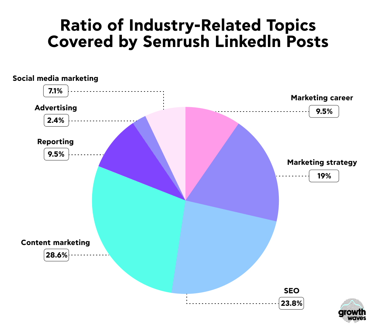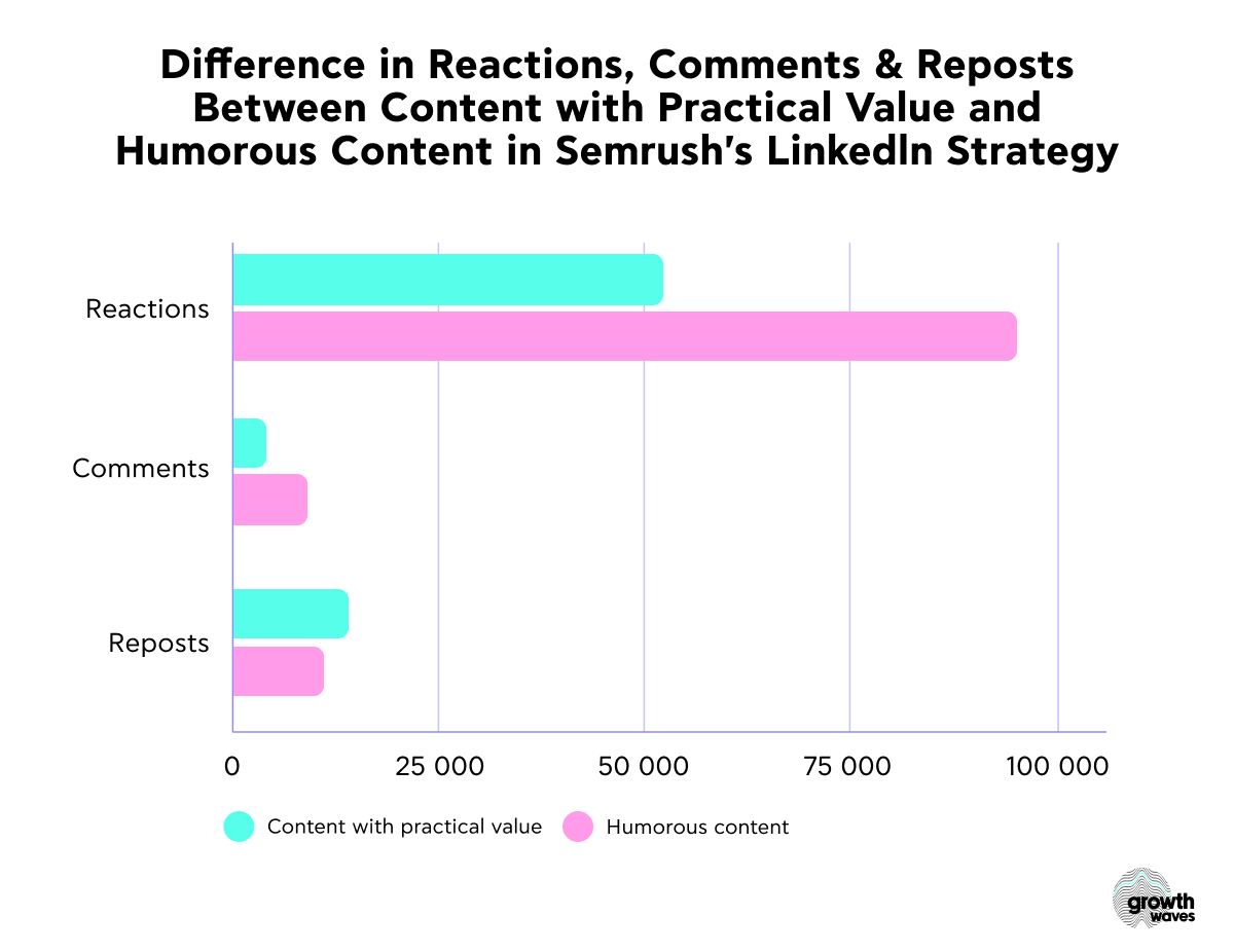 Two content types dominate Semrush’s LinkedIn content. These are posts on SEO & marketing and humorous content. The company publishes about 12 such posts per month on average.