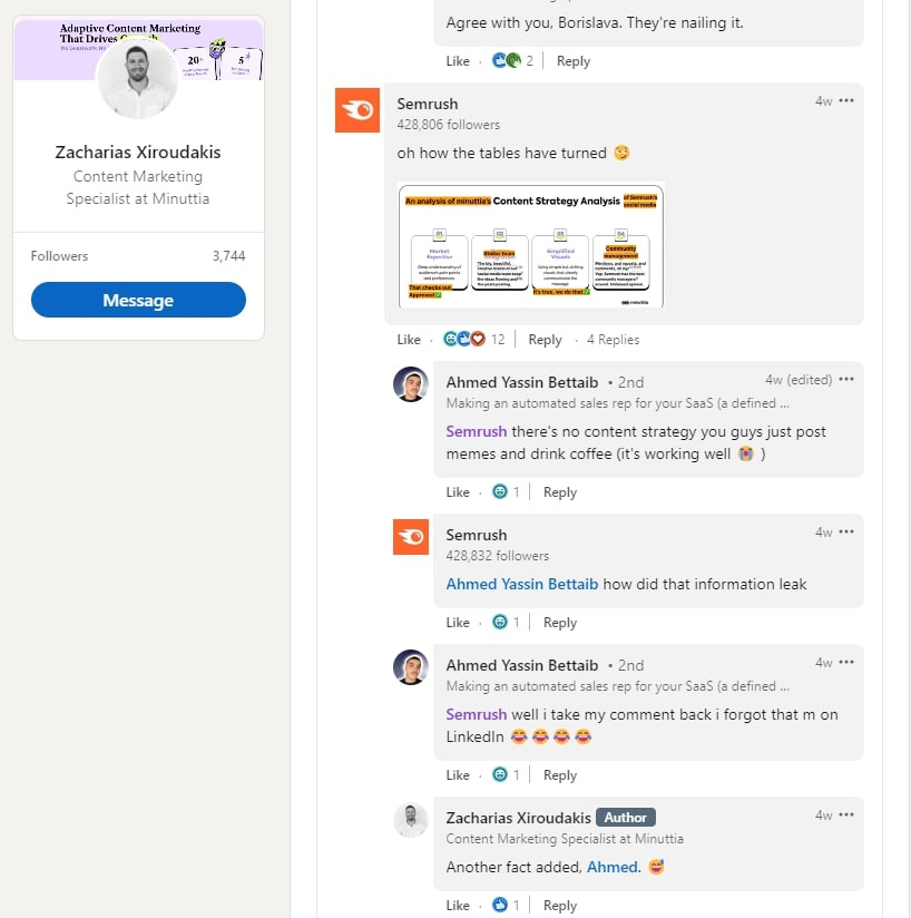 Minuttia’s own content marketing specialist Zach Xiroudakis, got a reaction from Semrush when promoting the new issue of our Adaptive Content Marketing newsletter.