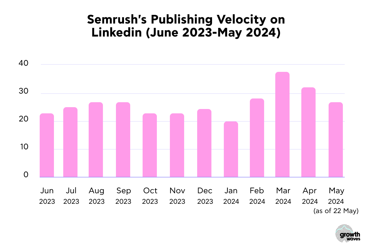 Semrush publishes about 26 posts a month on LinkedIn. This data is based on the period between June 2023 and May 2024 chosen for analysis.