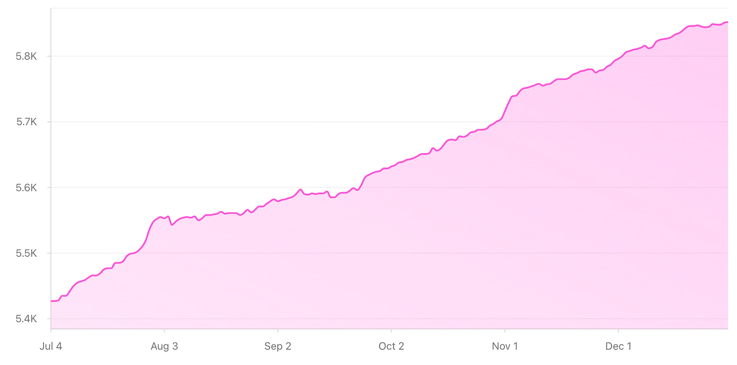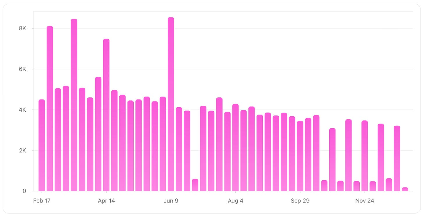 There were some dips, mostly from switching to a bi-weekly cadence and going inconsistent after launching Restartt, since priorities shifted.